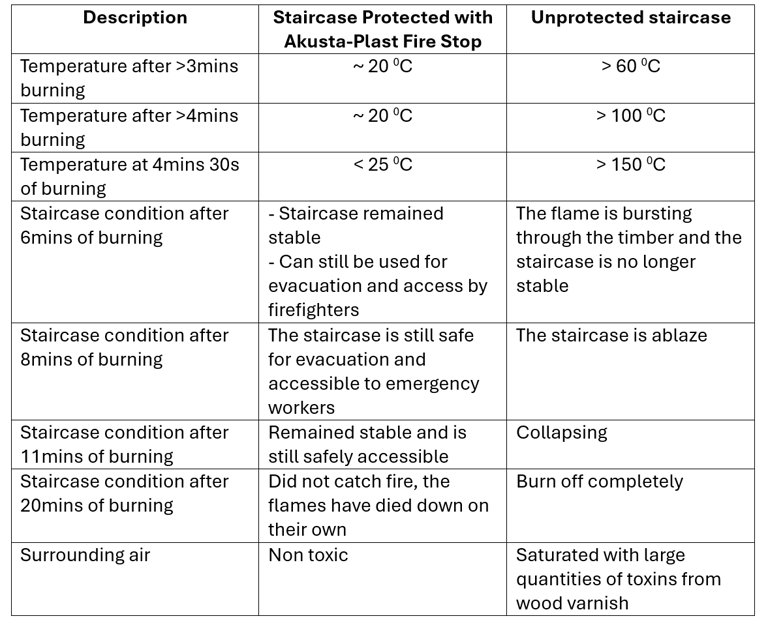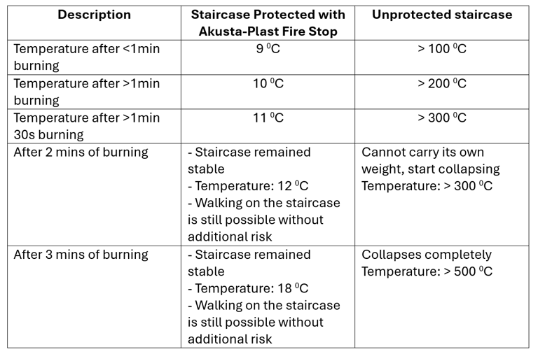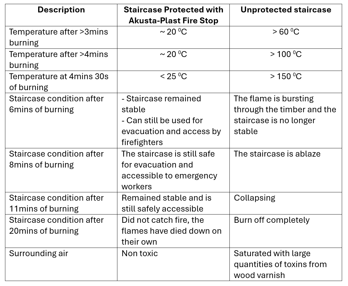 A wooden staircase protected by akuSta-Plast Fire Stop could still be used during evacuation or fire fighters entering the building.
